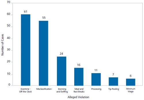 Most of the cases filed involved allegations of overtime and off-the-clock violations, with misclassification cases the next most prevalent. See Figure 3 for case filings by type of alleged violation.