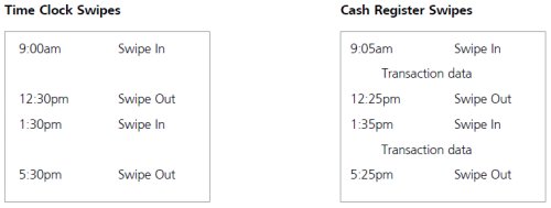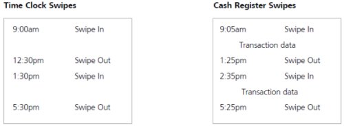 For example, suppose an employee had taken a meal period from 1:30 to 2:30pm but had forgotten to swipe. When reporting the omission to his manager, he misremembered and told the manager the meal period had been from 12:30 to 1:30. See Figure 4 for a sample comparison of data recorded in the time clock system with similar data recorded in the cash register system in such a situation.