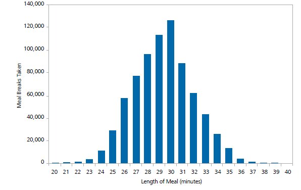 Consider a case where employees allege they were not given full 30-minute meal periods. Experts may attempt to use the timekeeping records to identify any meal period shifts that are less than 30 minutes and assert that each instance represents a situation where the employee was involuntarily required to return to work early from his/her meal period. However, a statistical review of the timekeeping data might reveal that while many meal periods are exactly 30 minutes long, employees frequently swiped in or out for periods both slightly shorter and slightly longer than 30 minutes. See Figure 6 for an example of employees recording meal breaks between 20 and 40 minutes long.