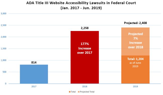 As of June 30, 2019, we counted 1204 website accessibility lawsuits filed in federal courts since January 1, 2019, for a projected total of 2408 by year end. This would constitute a seven percent increase over 2018's numbers.