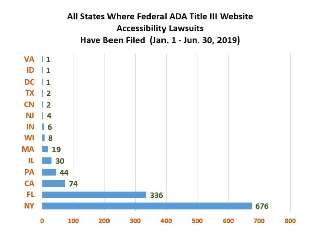[Graph: All States Where Federal ADA Title III Website Accessibility Lawsuits Have been Filed Jan. 1 to Jun. 30, 2019: NY: 676; FL: 336; CA: 74; PA: 44; IL: 30; MA: 19; WI: 8; IN: 6; NJ: 4; CN: 2; TX: 2; DC: 1; ID: 1; VA: 1]