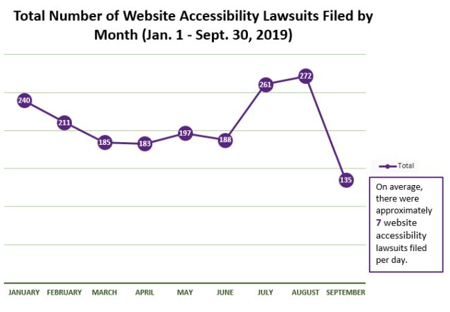 [Graph: Total Number of Website Accessibility Lawsuits Filed By Month in 2019 (Jan. 1 to Sept. 30, 2019): January: 240; February: 211; March: 185; April: 183; May: 197; June: 188; July: 261; August: 272; September: 135; On average, there were approximately 7 website accessibility lawsuits filed per day.]