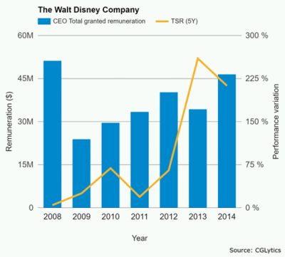 Utilising CGLytics' proprietary corporate governance global dataset and analytics tools, we are able to see exactly to what extent these acquisitions have paid off for Mr. Iger. During the period that the above-mentioned acquisitions were made by Disney, we see a steep increase in TSR, corresponding to a reciprocal increase in total granted compensation to Mr. Iger. However in late 2013/early 2014 we begin to see a decline in TSR.