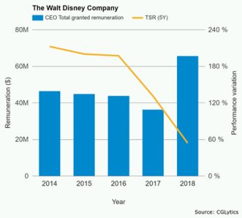 Using the same data and analytics available through the CGLytics platform, we reviewed Mr Iger's compensation in the period following his major acquisitions and the begin of the decline of Disney's TSR. This decline has mostly continued all the way through 2018, while Mr. Iger's total granted remuneration stagnating or even lowering, with 2018 serving as an outlier in terms of compensation. This upswing in total granted compensation probably reflects an increased payout to Mr. Iger following the announcement of the Disney/21CF merger, despite the downward slalom that Disney's TSR has taken since 2016.
