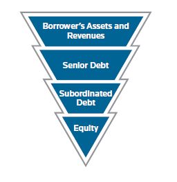 The liquidation value of the borrower's assets flows through the inverted pyramid, and gets paid to the borrower's creditors, with any residual liquidation proceeds being paid last to the borrower's equity holders.