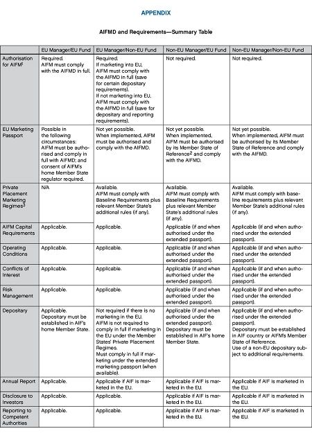 The AIFMD introduced significant obligations and restrictions on AIFMs relating to operational and compliance matters. A number of the provisions in the AIFMD have ramifications for the relationships between AIFMs and their service providers. The AIFMD also regulates the way in which AIFMs may market AIFs. The key provisions of the AIFMD are described in this White Paper. Furthermore, a table setting out the applicability and requirements of the AIFMD in respect of EU/non-EU AIFMs managing and/or marketing EU/non-EU AIFs is included in the Appendix.