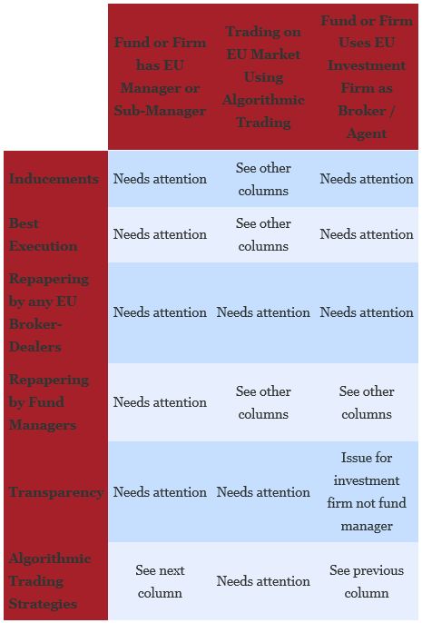 Among the changes are requirements for EU investment firms to disclose more information to their clients. Non-EU fund managers which use an EU broker subject to MiFID II will find that the broker needs to repaper the fund manager with new terms of business. Fund managers may need legal advice as to the proposed revised terms of their brokerage agreements.
