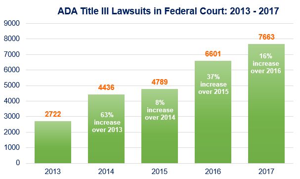 ADA Title III Lawsuits in Federal Court: 2013-2017: 2013 (2722); 2014 (4436, 63% increase over 2013); 2015 (4789, 8% increase over 2014); 2016 (6601, 37% increase over 2015); 2017 (7663, 16% over 2016)
