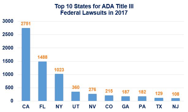 Top 10 States for ADA Title III Federal Lawsuits in 2016: CA (2751); FL (1488); NY (1023); UT (360); NV (276); CO (215); GA (187); PA (182); TX (129); NJ (108)