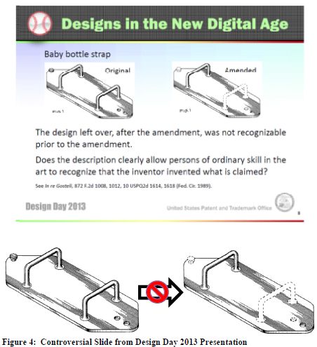 A heated Q&A period followed, with design patent practitioners responding (and some fuming and flailing) that the presentation defied years of USPTO practice (evidenced in the public prosecution histories of thousands of US design patents), and questioning the need for an abrupt policy shift (as well as a lack of transparency and proper procedure in making the shift).