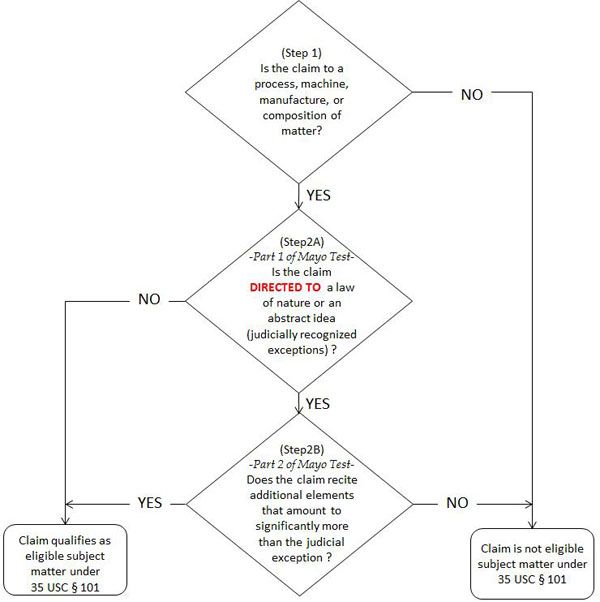 The USPTO memorandum informed USPTO examiners that they should continue to (1) perform an analysis under Step 2A of the two-part Alice/Mayo test in order to decide whether or not a claim is directed to an abstract idea and (2) determine if a claim sets forth or describes a concept that a Court has previously found to be abstract. The two-part Alice/Mayo test as implemented by the USPTO is summarized in the flow chart shown below as published in the Federal Register, 79(241), 74618-74633 (2014) as interim guidelines for subject matter eligibility of products and processes.