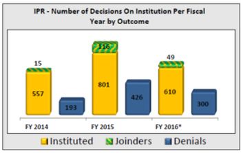 Thus far in FY 2016, the Board has denied instituting trial on about 33% of all IPR petitions. This is consistent with the denial rate in 2015 (34.7%) and illustrates a dramatic increase in the rate of institution denials since FY 2014 (25.7%). In these statistics, a trial that is instituted in part (where only a portion of the claims in the petition are instituted) is still counted as an institution.