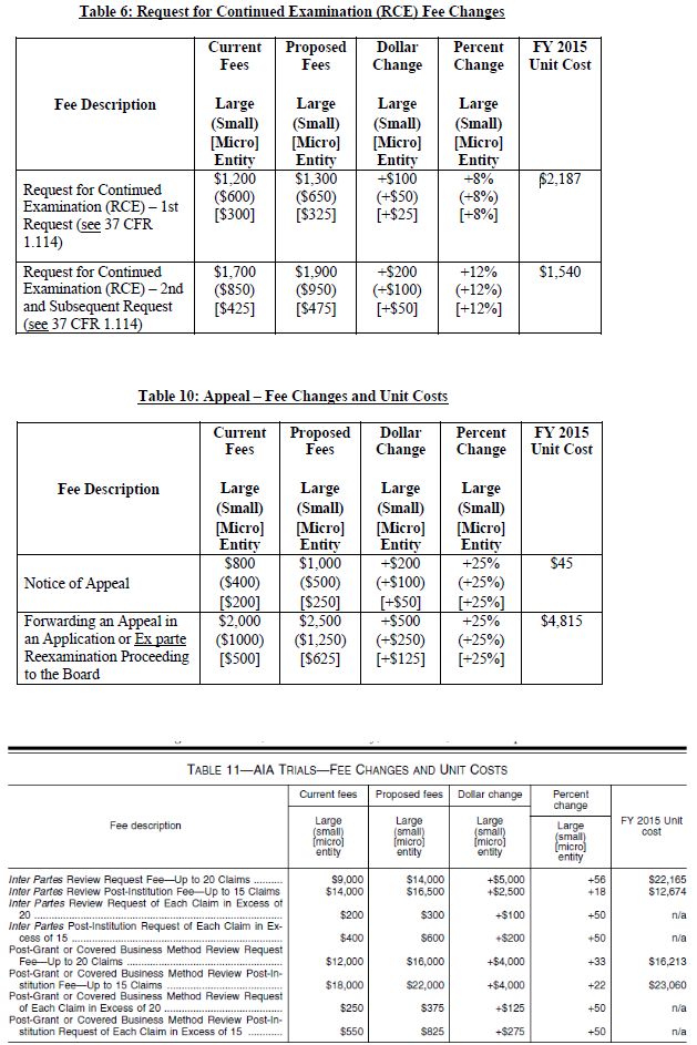 The Federal Register Notice provides more explanation for "significant" fee increases, which it proposes for items including RCEs, ex parte appeals, and patent trials. Thanks to PPAC, some of these increases are less than originally proposed.