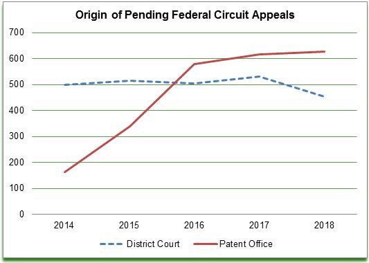 Data the Federal Circuit publishes show that appeals originating from cases decided by federal district courts no longer dominate its docket. Since 2016, the court received more appeals originating from the Patent Office than district courts.