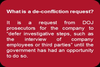 - "where requested, de-confliction of witness interviews and other investigative steps that a company intends to take as part of its internal investigation with steps that the Department intends to take as part of its investigation;"