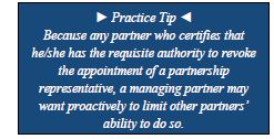 - Revocation of Partnership Representative: Any person who was a partner during the partnership taxable year and certifies that he/she has authority to do so, can revoke, on behalf of the partnership, a partnership representative or designated individual, but can only do so after IRS issues a notice of selection for examination or NAP for the partnership taxable year. A revocation must simultaneously appoint a replacement partnership representative or designated individual. A revocation based on a NAP must be made on an administrative adjustment request ("AAR").