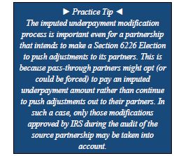 - Three other bases for modifications. IRS also proposed three additional methods of modification not included in the BBA Rules. First, a partnership may request modification of the number and composition of imputed underpayments. Second, a special modification is allowed for partners that are RICs and REITs where they can show that they have followed the procedures for deficiency dividends laid out in Section 860. Third, the IRS will allow an appropriate modification based on the contents of a closing agreement entered into under Section 7121.