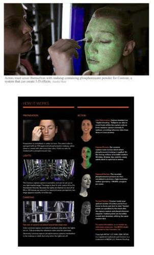 According to the original Complaint, the MOVA Contour technology relates to "performance motion capture," which is used to create a 3D animated character in a movie or video game in way that it moves like an actual human does. As early as 2000, "marker-based" motion capture systems could capture and track body movement, but tracking facial motion in a realistic manner had not been done. Rearden's MOVA Contour technology allegedly solved this problem. Rearden thus offered MOVA Contour as a service to companies, such as film studios and video game companies, that wanted to track facial motion realistically. The technology was introduced at a conference in 2006, and Rearden patented the technology. MOVA Contour consists of both hardware – a series of synchronized lights, cameras and hardware that records an actor's performance – and software that turns the recorded images into 3D scans per frame and then into data that can be used for computer generated images. Part of the process requires actors to use phosphorescent powder, as shown below.