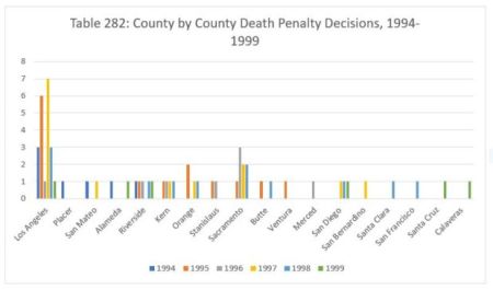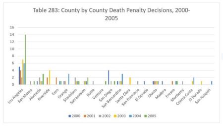 In Table 283, we report the data for the years 2000 through 2005. In 2000, five cases from Los Angeles County were decided. The Court decided four cases from San Diego and one each from Alameda, Orange, San Bernardino, El Dorado, Shasta and Madera counties. In 2001, the Court decided four death penalty cases from Los Angeles, two each from Riverside and Kern, and one apiece from Orange, Shasta and Fresno counties. In 2002, the Court decided two cases each from Los Angeles, Alameda and Stanislaus counties and one each from San Mateo, Sacramento, Butte, San Diego, San Bernardino, San Francisco, Shasta and Monterey counties. In 2003, the Court decided seven cases from Los Angeles, four from Riverside, two from Santa Clara, and one each from Alameda, Stanislaus, Sacramento, San Bernardino, Shasta, Contra Costa and El Dorado counties. In 2004, the Court decided six death penalty cases from Los Angeles, three each from Orange and San Bernardino, two from Contra Costa, and one apiece from Alameda, Kern, Stanislaus, Sacramento, Shasta, Fresno and San Joaquin counties. Finally, in 2005, the Court decided fourteen death penalty cases from Los Angeles, three from Alameda, two from Sacramento, and one each from San Mateo, Kern, Stanislaus, Ventura, San Diego and Fresno counties.