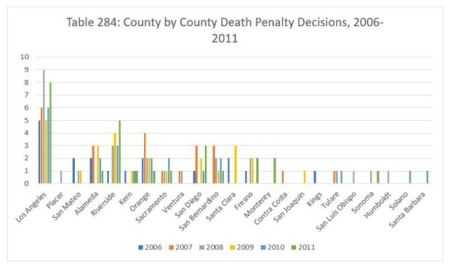We report the data for the years 2006 through 2011 in Table 284 below. In 2006, the Court decided five death penalty cases from Los Angeles, two each from San Mateo, Alameda, Orange and Santa Clara counties, and one apiece from Riverside, Kern, San Diego, Fresno and Kings counties. In 2007, the Court decided six cases from Los Angeles, four from Orange, three each from Alameda, San Diego and San Bernardino, and one case apiece from Sacramento, Ventura, Contra Costa and Tulare counties. In 2008, the Court decided nine cases from Los Angeles, three from Riverside, two each from Orange, San Bernardino and Fresno counties, and one each from Placer, San Mateo, Sacramento, Ventura, Tulare, San Luis Obispo, Sonoma and Humboldt counties. In 2009, the Court decided five cases originating from Los Angeles County, four from Riverside, three from Alameda and Santa Clara, two from Orange, San Diego and Fresno counties, and one apiece from San Mateo, Kern, Sacramento, San Bernardino and San Joaquin counties. In 2010, six cases were decided from Los Angeles County, three cases from Riverside, two each from Alameda, Orange, Sacramento and San Bernardino counties, and one each to Kern, San Diego, Tulare, Solano and Santa Barbara counties. In 2011, the Supreme Court decided eight cases from Los Angeles county, five from Riverside, three from San Diego, two from Fresno and Monterey, and one apiece from Alameda, Kern, Orange, Sacramento, San Bernardino and Sonoma counties.