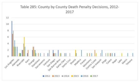 In 2015, Riverside led with six death penalty cases. The court decided three cases from Los Angeles, three from Orange and two from Shasta. The Court decided one case each from Alameda, San Bernardino, Contra Costa and Lake counties. In 2016, the Court decided five cases originating in Los Angeles County, three in Riverside, two apiece in Orange, Madera and San Joaquin counties, and one each in Alameda, Stanislaus, San Diego, San Bernardino, Santa Clara, Shasta, Monterey, Tulare, Marin and Tehama counties. In 2017, the Court has to date decided three death penalty cases from Los Angeles, and one each from Alameda, Orange, Fresno and Kings counties.