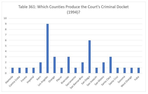 In 1994, the Court decided nine criminal cases from Los Angeles. The Court decided six cases from San Diego, three from Orange, Riverside and Santa Clara counties, and two apiece from Kern, San Bernardino and San Mateo counties. Finally, the Court decided one case from Alameda, Contra Costa, Fresno, Imperial, Placer, Sacramento, San Joaquin, Santa Cruz, Sonoma, West Orange and Yuba counties.