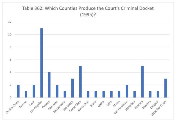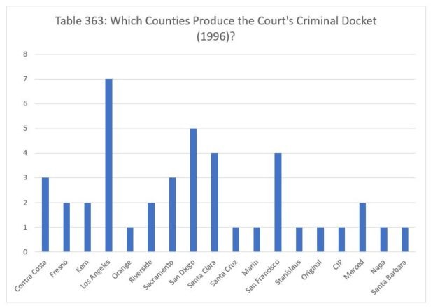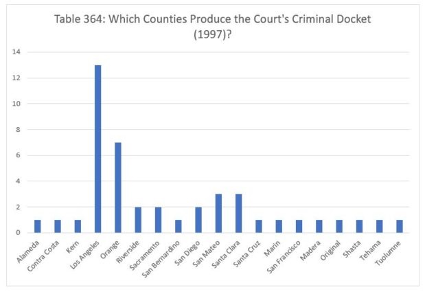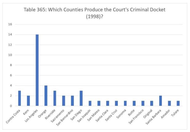 Finally, we report the data for 1998. The Court decided fourteen criminal cases from Los Angeles. The Court decided four cases from Orange County. The Court decided three cases from Contra Costa, Riverside and San Diego counties, and two each from Kern, Sacramento, San Bernardino and Santa Barbara counties. Finally, the Court decided one case apiece from San Joaquin, San Mateo, Santa Clara, Santa Cruz, Sonoma, Butte, San Francisco, Amador and Tulare counties, and one case from the Court's original jurisdiction.