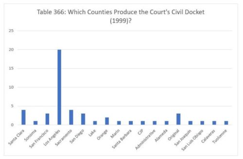 In 1999, as always, Los Angeles led the way, as the Court decided twenty civil cases originating there. Santa Clara and Sacramento counties produced four cases apiece; San Francisco and San Diego counties produced three each, and the Court decided three cases arising under its original jurisdiction. The Court decided two civil cases from Orange County, and one each from Sonoma, Lake, Marin, Santa Barbara, Alameda, San Joaquin, San Luis Obispo, Calaveras and Tuolomne counties, plus one direct administrative appeal and one case from the Council on Judicial Performance.