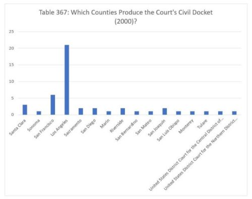 In 2000, the Court decided twenty-one civil cases originating in trial court in Los Angeles. The Court decided six cases from San Francisco, three from Santa Clara, two from Sacramento, San Diego, Riverside and San Joaquin, and one case each from Sonoma, Marin, San Bernardino, San Mateo, San Luis Obispo, Monterey and Tulare counties, and one certified question each from the United States District Courts for the Northern and Central Districts of California.