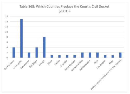 In 2001, the civil caseload from Los Angeles was down to fifteen. The Court decided eight civil cases from Orange County, four from San Francisco and four from San Diego, and two from Sacramento, San Bernardino and Kern counties, two direct administrative appeals and two certified questions originating in the Central District of California. The Court decided one civil case each from Marin, Fresno, Riverside, Santa Barbara, San Joaquin and Kings counties.