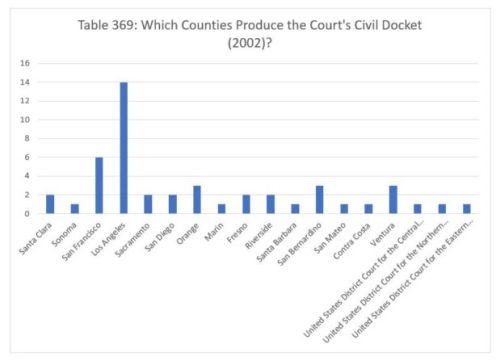 In 2002, the Court decided fourteen civil cases from Los Angeles County. The Court decided six cases from San Francisco, three from Orange, San Bernardino and Ventura counties, and two from Santa Clara, Sacramento, San Diego, Fresno and Riverside counties. The Court decided one case apiece from Sonoma, Marin, Santa Barbara, San Mateo and Contra Costa counties, as well as single certified question appeals from the Northern, Central and Eastern Districts of California.