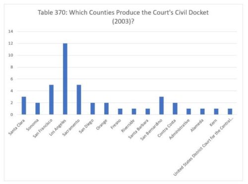 In 2003, the Court decided a dozen civil cases from Los Angeles. The Court decided five cases each from San Francisco and Sacramento, three from Santa Clara and San Bernardino counties, and two from Sonoma, Orange and Contra Costa counties. The Court decided one civil case from Fresno, Riverside, Santa Barbara, Alameda and Kern counties, one direct administrative appeal, and one certified question from the Central District of California.
