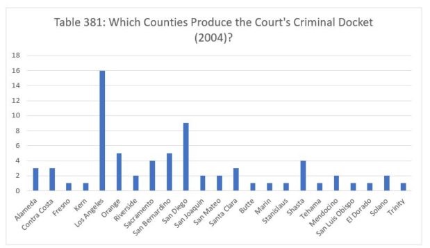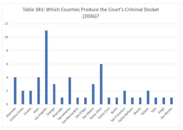 The Court decided only eleven criminal cases from Los Angeles in 2006. The Court decided six cases from Santa Clara County, four from Alameda, Kern and Sacramento counties, and three from Orange and San Mateo counties. The Court decided two criminal cases each from Contra Costa, Fresno, San Francisco and Solano counties. The Court decided one criminal case each from Riverside, San Bernardino, San Diego, Santa Cruz, Butte, Santa Barbara, Shasta, Yolo, Kings and San Benito counties.
