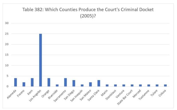 In 2005, the Court decided twenty-five criminal cases from Los Angeles. It decided four criminal cases from Alameda, Kern, Orange and Sacramento counties, three from San Diego and Santa Clara counties, and two from Fresno and San Mateo counties. The Court decided one case apiece from Riverside, San Joaquin, Marin, Stanislaus, Ventura, Merced, Tuolumne, Tulare and Colusa counties, as well as one case from the State Bar Court.