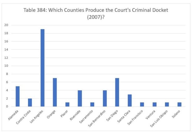 In 2007, the Court decided nineteen criminal cases from Los Angeles County, The Court decided seven cases from Orange and San Diego counties, five from Alameda, four from Riverside and San Bernardino counties, three from Santa Clara County, and two from Contra Costa County. The Court decided one case each from Placer, Sacramento, San Francisco, Ventura, San Luis Obispo and Solano counties.