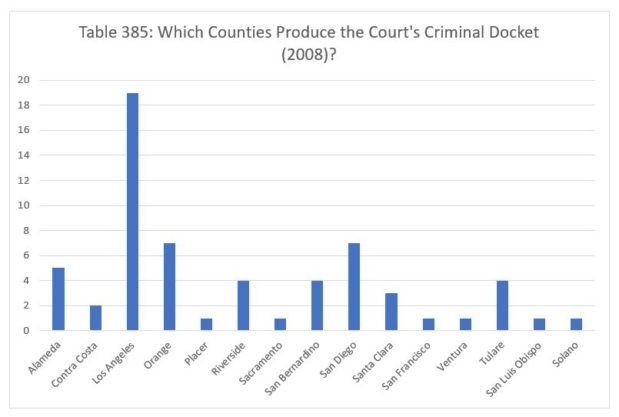 Finally, in 2008, the Court decided nineteen criminal cases from Los Angeles County. The Court decided seven cases from Orange and San Diego, five from Alameda, four from Riverside, San Bernardino and Tulare counties, and three from Santa Clara County. The Court decided two cases from Contra Costa County, and one case each from Placer, Sacramento, San Francisco, Ventura, San Luis Obispo and Solano counties.