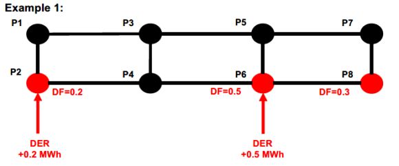 In one example, CAISO describes an aggregation of similar energy resource types that are located at three different pricing nodes:P2, P6 and P8. In this example, the scheduling coordinator submits a bid for one MWh with distribution factors of 0.2 at P2, 0.5 at P6, and 0.3 at P8.