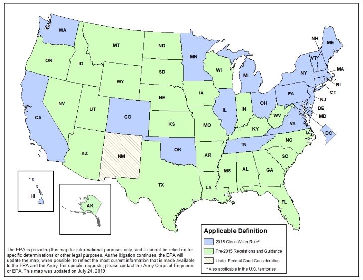 To minimize these case-by-case evaluations and provide predictability for the frustrated, and often outraged, regulated community, the EPA and the Corps under the Obama Administration published the Clean Water Rule in August 2015, which provided a WOTUS definition, which we covered in an earlier article. But the Clean Water Rule barely made it out of publication before challenges were filed across the country--by states and industry groups that saw the Clean Water Rule as government overreach and by environmental interest groups that saw it as failing the Act's protective goals. By October 2015, there was a nationwide stay halting the application of the Clean Water Rule. The stay was vacated in early 2018, but the confusion remained: twenty-two states now follow the Clean Water Rule while the remaining 28 follow the pre-2015 regulations and guidance that came out of Rapanos.