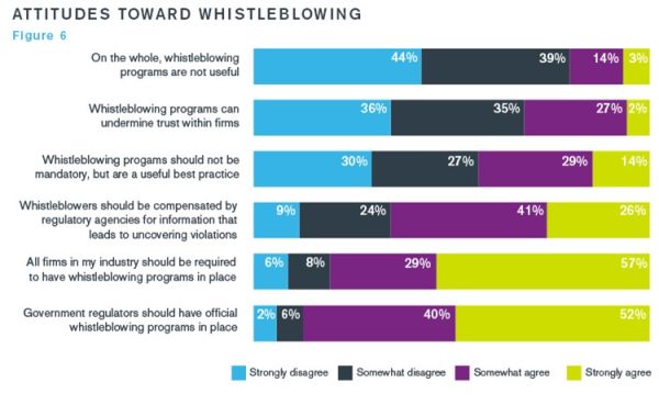 Furthermore, it is interesting to note that the percentage of respondents with whistleblowing programs in place (73 percent) lags behind the percentage of those who at least somewhat agree that whistleblowing programs should be mandatory (86 percent). Clearly there remains work to be done.