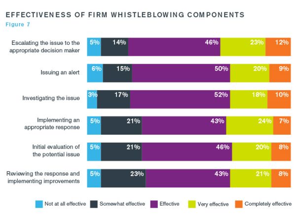 However, just because a firm has implemented a whistleblowing program that meets legal and regulatory requirements does not mean that the program will be strategically useful. For a whistleblowing program to be a true asset, it must be operationally effective and supported by the culture of the firm. Our survey shows that for any given component of a whistleblowing program, between roughly one-fifth (19 percent) and one-quarter (28 percent) of respondents feel their firm is less than effective; the whistleblowing programs of 32 percent of the firms surveyed have at least one component that is less than effective (see Figure 7).