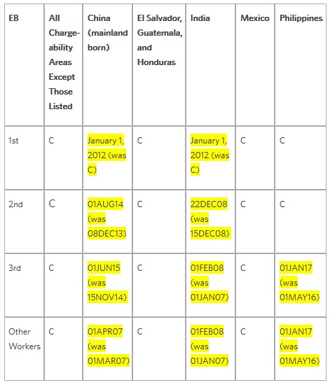 EB-1 will remain "current" for all chargeable countries, including India and China. The EB-2 cutoff dates for the rest of the world and the El Salvador, Guatemala, Honduras, Mexico, and Philippines allotment will also remain "current." Cutoff dates for EB-2 India will remain at February 8, 2009, and for China "other workers" the cutoff dates will remain at June 1, 2008.