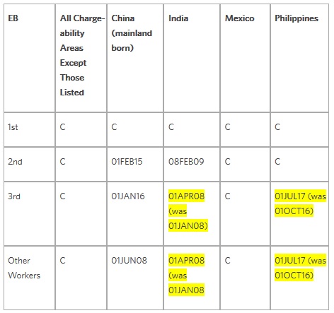 The Dates for Filing chart shows advancement for India and the Philippines cutoff dates only. Cutoff dates for EB-3 India and India "other workers" will advance by three months to April 1, 2008. Cutoff dates for EB-3 Philippines and Philippines "other workers" will advance by nine months to July 1, 2017.