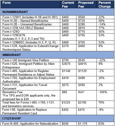 Filing fees for adjustment applications and ancillary benefits would nearly double, as would fees for naturalization. Employers petitioning for nonimmigrant employees would be subject to fee increases of up to 77%, depending on the nonimmigrant classification sought.
