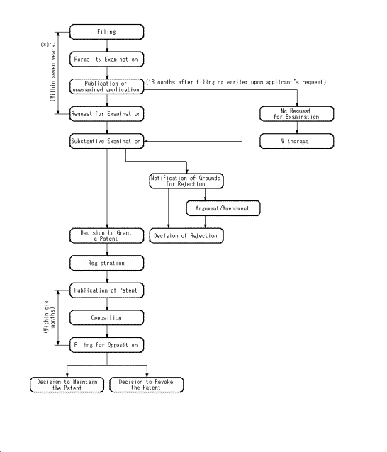 A chart below shows the steps in prosecution of a patent application in Japan.